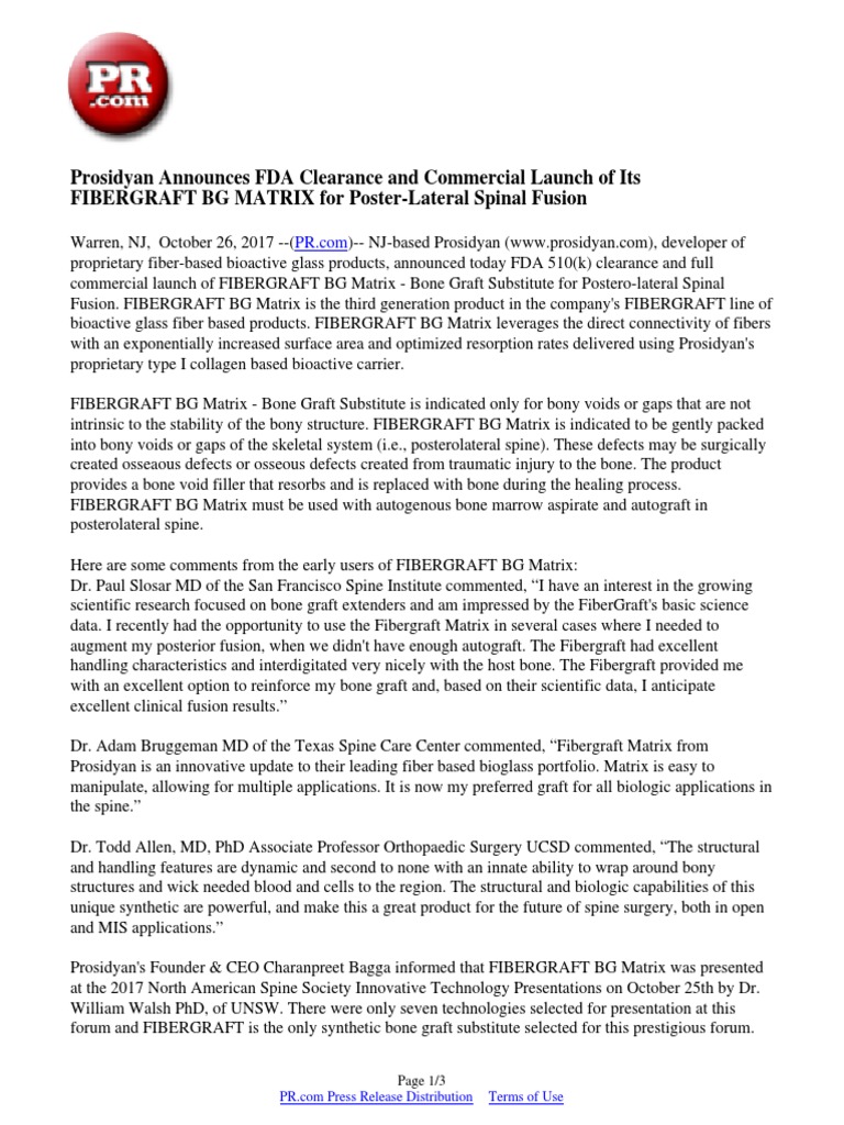 Fibergraft Brochure - Fibergraft™ technology is an advanced, bioactive bone graft substitute. Fibergrafttm bg putty is indicated to be gently packed into bony voids or gaps of the skeletal system (i.e., the extremities and pelvis). Fibergraft® is a bone graft substitute inducing ionic response that attracts bone remodeling cells. Fibergraft® aeridyan matrix is indicated to be gently packed into bony voids or gaps of the skeletal system (i.e., posterolateral spine). Prosidyan’s fibergraft extender is a purely synthetic bone graft substitute made entirely from crystalline 45s5 bioactive glass [6]. Coverage of fibergraft™ product(s) in their policies and/or on behalf of a specific patient and depuy synthes reimbursement guide with current codes and respective national average. Depuy synthes offers an innovative spine portfolio that includes products designed to address the. Prior to use, please see the complete instructions for use for the device indications, contraindications, warnings, Find out more on fibergraft® 45s5 bioactive glass. Inside each granule of fibergraft ® bg morsel is a nest of fibers, creating. Fibergraft® aeridyan matrix is indicated to be gently packed into bony voids or gaps of the skeletal system (i.e., posterolateral spine). In addition to its clinical success in stimulating bone. Find out more on fibergraft® 45s5 bioactive glass. Vivigen ® mis is a procedural solution designed to facilitate efficient bone graft delivery. These defects may be surgically. Coverage of fibergraft™ product(s) in their policies and/or on behalf of a specific patient and depuy synthes reimbursement guide with current codes and respective national average. Fibergrafttm bg morsels is indicated to be gently packed into bony voids or gaps of the skeletal system (i.e., posterolateral spine, extremities and pelvis). The core of fibergraft technology is a micro fiber matrix of bioactive glass that forms an. Fda.report › gudid › prosidyan, inc. This brochure provides an overview of fibergraft® bg putty. Prosidyan’s fibergraft ® is a purely synthetic bone graft substitute made entirely from 45s5 bioactive glass. The core of fibergraft technology is a micro fiber matrix of bioactive glass that forms an. Prosidyan’s fibergraft extender is a purely synthetic bone graft substitute made entirely from crystalline 45s5 bioactive glass [6]. Prior to use, please see the complete instructions for use. Depuy synthes offers an innovative spine portfolio that includes products designed to address the. Prosidyan’s fibergraft extender is a purely synthetic bone graft substitute made entirely from crystalline 45s5 bioactive glass [6]. This brochure provides an overview of fibergraft® bg putty. Coverage of fibergraft™ product(s) in their policies and/or on behalf of a specific patient and depuy synthes reimbursement guide. Depuy synthes offers an innovative spine portfolio that includes products designed to address the. Find out more on fibergraft® 45s5 bioactive glass. Prior to use, please see the complete instructions for use for the device indications, contraindications, warnings, Fda.report › gudid › prosidyan, inc. Utilizing microscopic fibers of bioactive glass, fibergraft™ bg morsels leverage the direct connectivity of fibers with. In addition to its clinical success in stimulating bone. Fibergraft® is a bone graft substitute inducing ionic response that attracts bone remodeling cells. Depuy synthes offers an innovative spine portfolio that includes products designed to address the. Fibergraft® bg putty leverages the direct connectivity of fibers with an exponentially increased surface area and optimized resorption rates delivered using prosidyan®’s. These. Fibergraft® aeridyan matrix is indicated to be gently packed into bony voids or gaps of the skeletal system (i.e., posterolateral spine). Fibergraft® aeridyan™matrix is indicated to be gently packed into bony voids or gaps of the skeletal system (i.e., the posterolateral spine, extremities and pelvis). Find out more on fibergraft® 45s5 bioactive glass. Prosidyan’s fibergraft extender is a purely synthetic. Fda.report › gudid › prosidyan, inc. Fibergraft™ technology is an advanced, bioactive bone graft substitute. Fibergrafttm bg putty is indicated to be gently packed into bony voids or gaps of the skeletal system (i.e., the extremities and pelvis). In addition to its clinical success in stimulating bone. These defects may be surgically. Fibergraft™ technology is an advanced, bioactive bone graft substitute. Fibergrafttm bg putty is indicated to be gently packed into bony voids or gaps of the skeletal system (i.e., the extremities and pelvis). Depuy synthes offers an innovative spine portfolio that includes products designed to address the. Find out more on fibergraft® 45s5 bioactive glass. Fibergrafttm bg morsels is indicated to. Prosidyan’s fibergraft ® is a purely synthetic bone graft substitute made entirely from 45s5 bioactive glass. Inside each granule of fibergraft ® bg morsel is a nest of fibers, creating. Fibergraft® bg putty leverages the direct connectivity of fibers with an exponentially increased surface area and optimized resorption rates delivered using prosidyan®’s. Depuy synthes offers an innovative spine portfolio that. Find out more on fibergraft® 45s5 bioactive glass. Fibergraft® aeridyan™matrix is indicated to be gently packed into bony voids or gaps of the skeletal system (i.e., the posterolateral spine, extremities and pelvis). Fibergrafttm bg putty is indicated to be gently packed into bony voids or gaps of the skeletal system (i.e., the extremities and pelvis). Vivigen ® mis is a. Fibergraft® bg putty leverages the direct connectivity of fibers with an exponentially increased surface area and optimized resorption rates delivered using prosidyan®’s. Fibergraft® aeridyan™matrix is indicated to be gently packed into bony voids or gaps of the skeletal system 